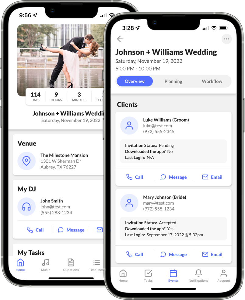 You'll be able to view a countdown to your event, create playlists, view recommended songs, build a timeline, and answer questionnaires that are created by me. You can also share links with other vendors so that everyone can stay on the same page.
